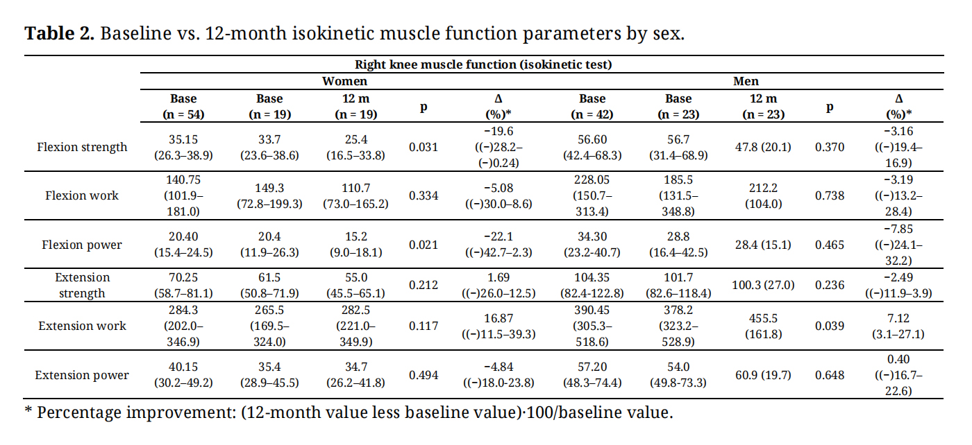 Table 2. Baseline vs. 12-month isokinetic muscle function parameters by sex.