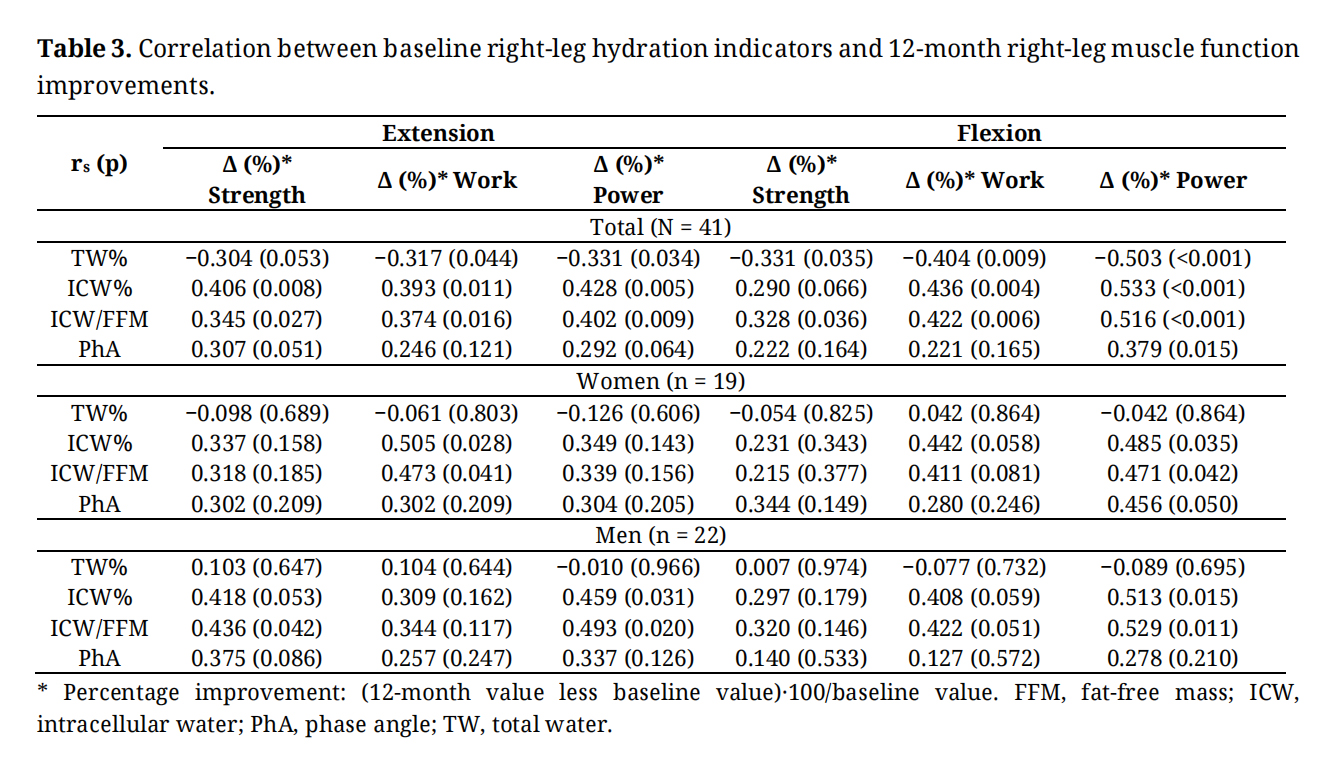 Table 3. Correlation between baseline right-leg hydration indicators and 12-month right-leg muscle function improvements.