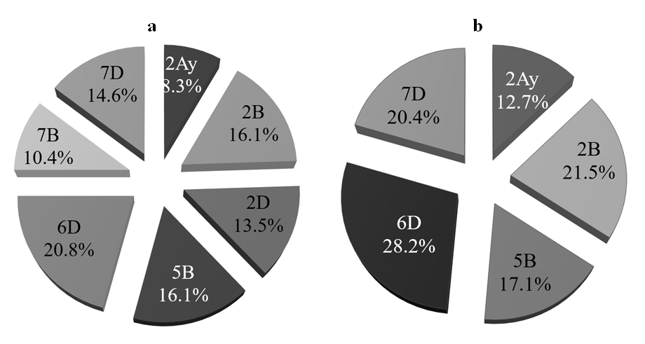 The frequency with which individual resistance genes were retained as a result of the selection procedure was tested in three of the four populations (“Yangmai#6” × “Mon/Ald”, “Yangmai#6” × “Chirya#3” and “Yangmai#6” × “Tia#1”). The “Ning#8201” chromosome 2D and 7B resistance genes were not included here, because their intrachromosomal locations have not yet been determined. The locus on chromosome 6D was present in 20.8% of the selections, while the chromosome 2B and 5B loci were each represented in 16.1% of the selections. The “Yangmai#6” chromosome 2A locus was inherited by 8.3% of the selections (Figure 3a). Among the “Yangmai#6” × “Ning#8201” selections, the most frequently retained locus was on chromosome 6D (28.2%), followed by that on chromosome 2B (21.5%) and that on chromosome 7D (20.4%). The locus on chromosome 2A was retained by just 12.7% of the selections (Figure 3b).