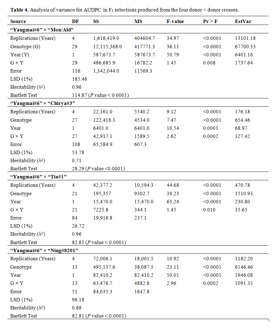 The selections made from three of the populations showed lower mean AUDPC in F5 except “Yangmai#6” × “Mon/Ald” (Figure 1, Table 3). “Yangmai#6” was generally associated with a higher AUDPC than the other three donors; the sole exception was “Tia#1” in the second year (Supplementary Figure S2a–h, Table 1). The “Yangmai#6” × “Ning#8201” F4 and F5 selections” mean AUDPCs were, respectively 153.3 ± 12.2 and 168.7 ± 18.0; the equivalent AUDPCs for the “Yangmai#6” × “Chirya#3” and “Yangmai#6” × “Mon/Ald” selections were 197.2 ± 4.7 and 187.6 ± 16.3, and 418.5 ± 17.9 and 375.0 ± 23.5, respectively. In each case, there was a significant contribution made by the environment (year) to the variance (Table 4). The h2 parameter ranged from 0.71 to 0.96 (Table 4). The intergenerational (F4 vs F5) correlations ranged from +0.57 (“Yangmai#6” × “Mon/Ald”) to +0.68 (“Yangmai#6” × “Chirya#3”) (Table 3).