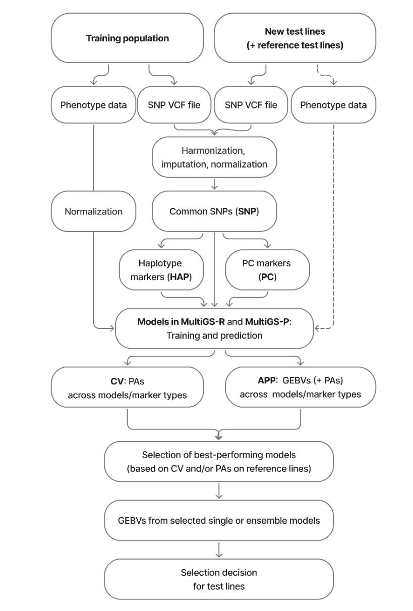 Figure 1. Schematic overview of the genomic prediction platform used to predict the genomic estimated breeding values (GEBVs) of new breeding lines with MultiGS-R and MultiGS-P. The reference test lines with phenotypic data and the dotted box containing phenotypic data from the test population are optional and used only for model evaluation and model selection when available.