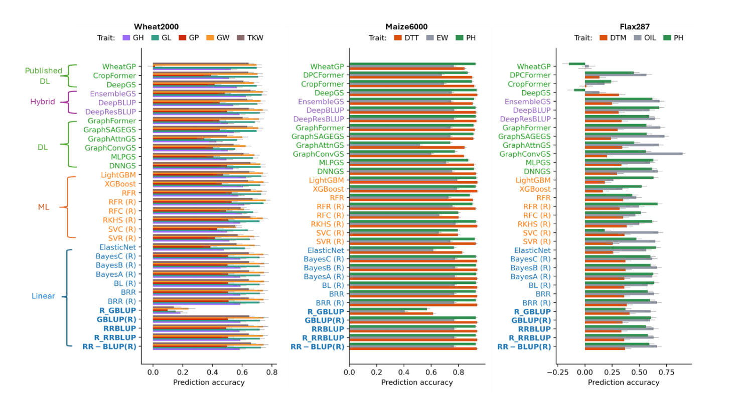Across wheat2000, maize6000, and flax287 datasets, the results showed that classical linear models such as RR-BLUP remain strong and reliable baselines, while selected DL, hybrid, and ensemble models implemented in MultiGS achieve comparable or superior PA under appropriate conditions. The flax across-population case study demonstrated that prediction robustness, rather than peak accuracy under idealized validation, remains the primary challenge for actual breeding applications. In this context, graph-based and BLUP-integrated hybrid models exhibited more stable generalization than many high-capacity DL architectures.