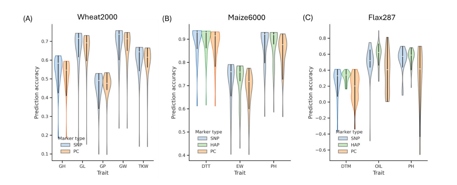 In comparison, for the maize6000 and flax287 datasets, where HAP markers could be constructed, HAP markers consistently outperformed both SNP and PC markers. In maize, haplotype-based models achieved the highest PAs across all three traits, with an average PA of 0.831 compared with 0.800 for PC-based models. Improvements were particularly notable for EW (0.719 vs. 0.680) and PH (0.878 vs. 0.842), highlighting the value of capturing local linkage disequilibrium (LD) in a genetically diverse hybrid population.