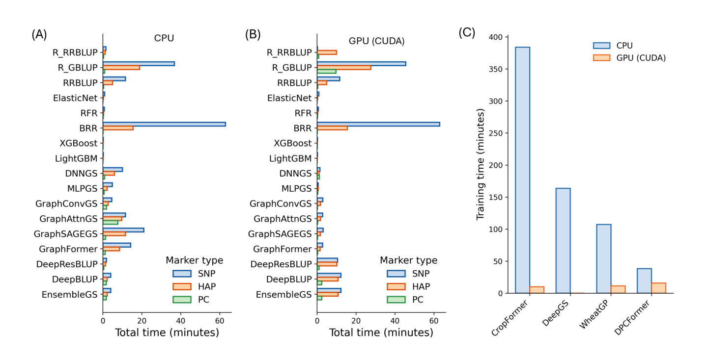 Figure 5. Runtime performance of deep learning models compared with linear and machine-learning models under CPU and GPU environments on the high-performance computing server. A total of 17 models implemented in MultiGS-P and four previously published tools were evaluated using the maize6000 dataset. Total time represents the average training time required for model fitting of each trait. All benchmarks were conducted across three traits. (A) and (B) Runtime (minutes) for 17 models under CPU and GPU environments, respectively. (C) Runtime (minutes) for four previously published deep learning models using SNPs.