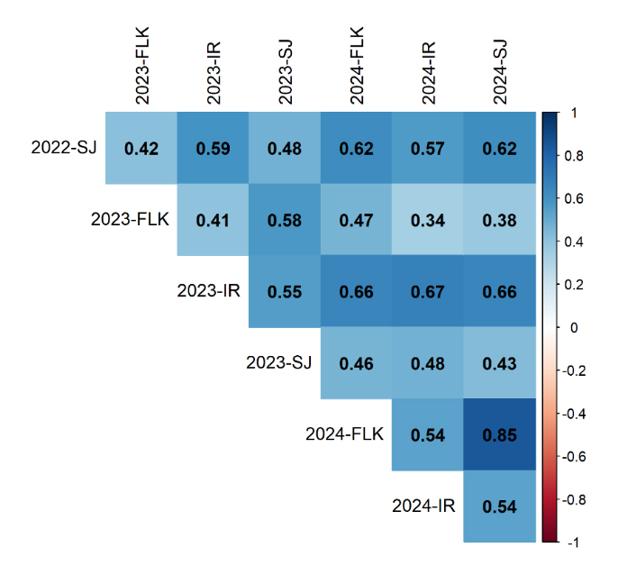Figure 2. Pairwise Pearson correlations among multi-environment STB trials from 2022–2024. Each cell represents the correlation coefficient between trials, with shading intensity proportional to the strength of correlation. Trials are labeled by year and environment: SJ = Sejet; FLK RAN = Flakkebjerg, randomized replicate; FLK NORM = Flakkebjerg, normalized replicate; IR = Irish trials. Values range from –1 (perfect negative) to +1 (perfect positive), with darker blue indicating stronger positive correlations.