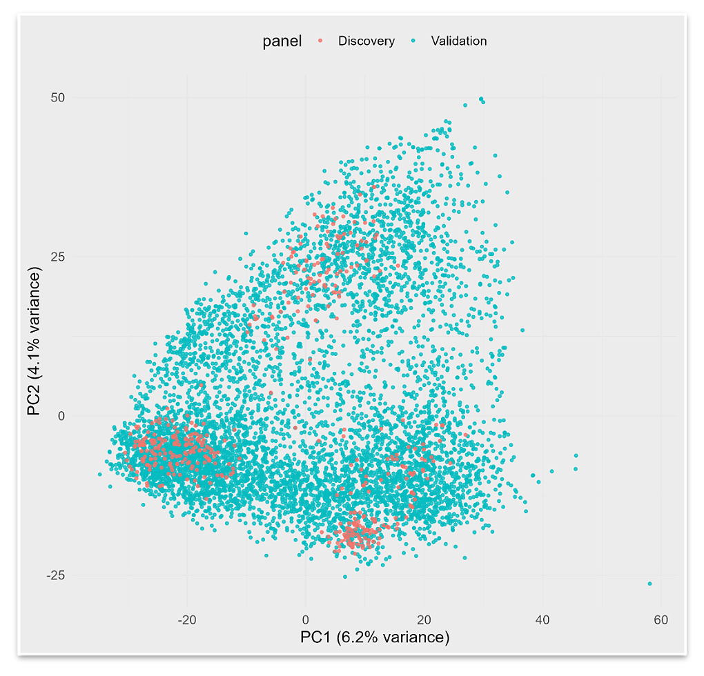Population Structure and Genetic RelatednessTo quantify the genetic relationship between the discovery and validation panels, a principal component analysis (PCA) was conducted using shared genome-wide SNP data. After applying quality control filters (call rate ≥ 0.90, minor allele frequency ≥ 0.05), 6,065 high-quality markers were retained. Missing genotypes were imputed with the major allele, and SNPs were encoded in a binary format (major allele = 0, minor allele = 1). The genotype matrix was mean-centered and scaled prior to PCA using the prcomp function in R.