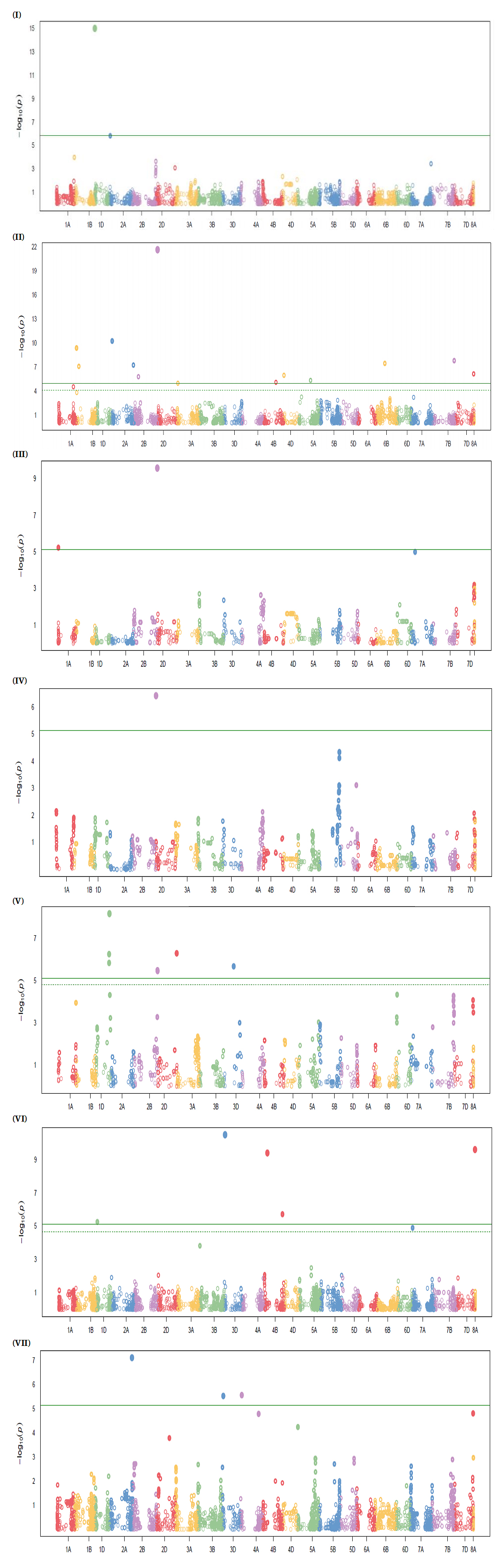 Figure 4. Manhattan plots of genome-wide association study (GWAS) results for STB resistance in the discovery panel. The y-axis represents −log₁₀(p), and the x-axis shows chromosomal position across the 21 wheat chromosomes. The solid horizontal line indicates the Bonferroni significance threshold and the dashed line indicates the false discovery rate (FDR) threshold. (I) Population 4, environment SJ-2023: significant association on chromosome 1A (Excalibur_c55959_651). (II) Entire discovery panel (across-environment BLUPs): significant associations on chromosomes 1D (TA004380-0460), 2A (AX-158572447), 2B (AX-158540908), 4D (AX-89483131), and 7D (AX-94821207). (III) Population 1, environment SJ-2022: significant association on chromosome 7A (AX-158567495). (IV) Population 1, environment SJ-2024: significant association on chromosome 2B (AX-110524801). (V) Population 5 (BLUP analysis): significant associations on chromosomes 2B (BS00100118_51) and 2D (AX-94644192). (VI) Population 2, environment SJ-2022: significant associations on chromosomes 3D (Kukri_c5411_1312) and 7D (BS00103401_51). (VII) Population 2, environment SJ-2022: significant association on chromosome 3D (Kukri_c4230_398).