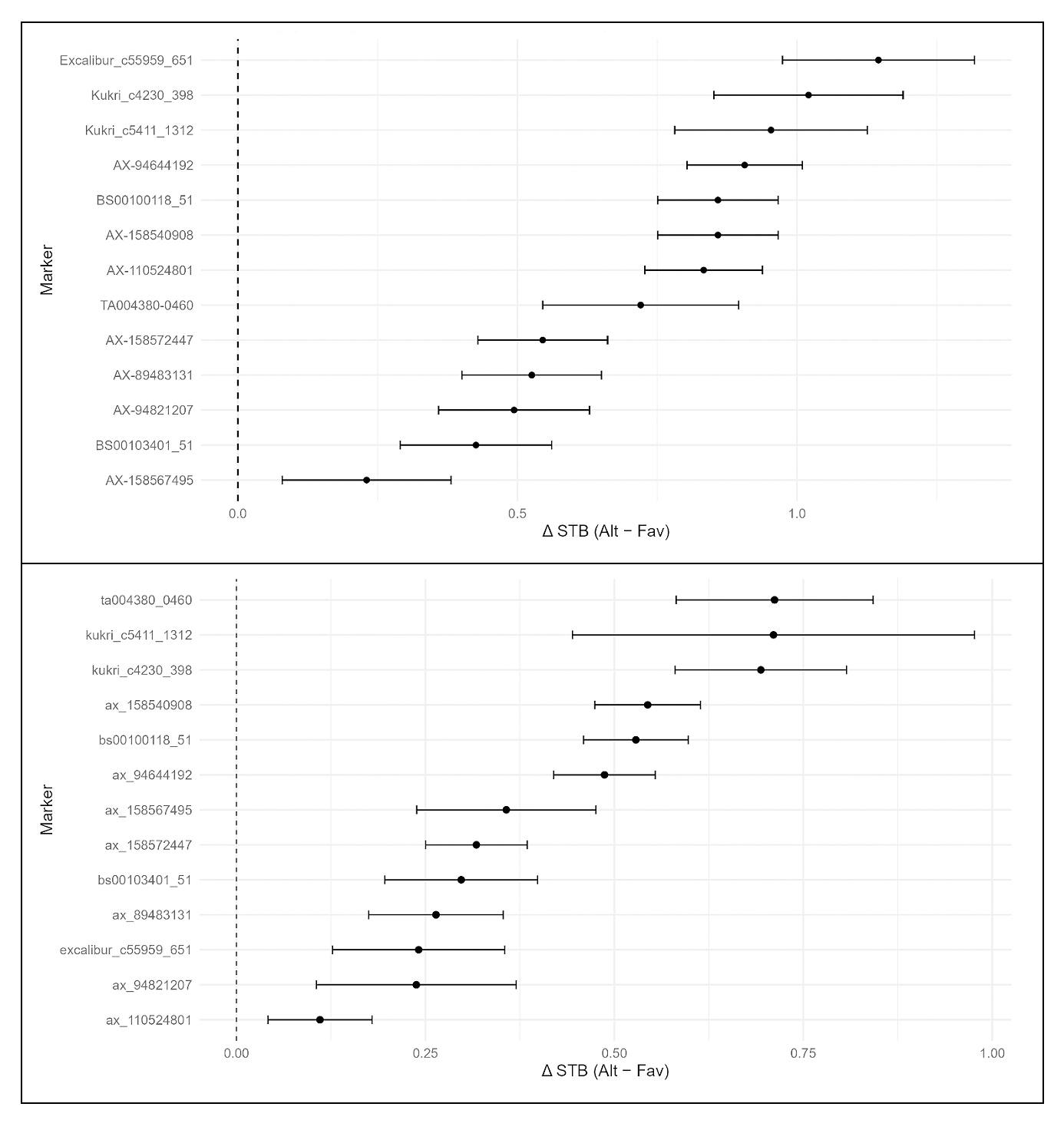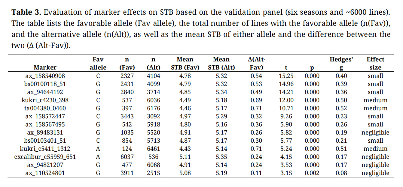 Table 3. Evaluation of marker effects on STB based on the validation panel (six seasons and ~6000 lines). The table lists the favorable allele (Fav allele), the total number of lines with the favorable allele (n(Fav)), and the alternative allele (n(Alt)), as well as the mean STB of either allele and the difference between the two (Δ (Alt-Fav)).