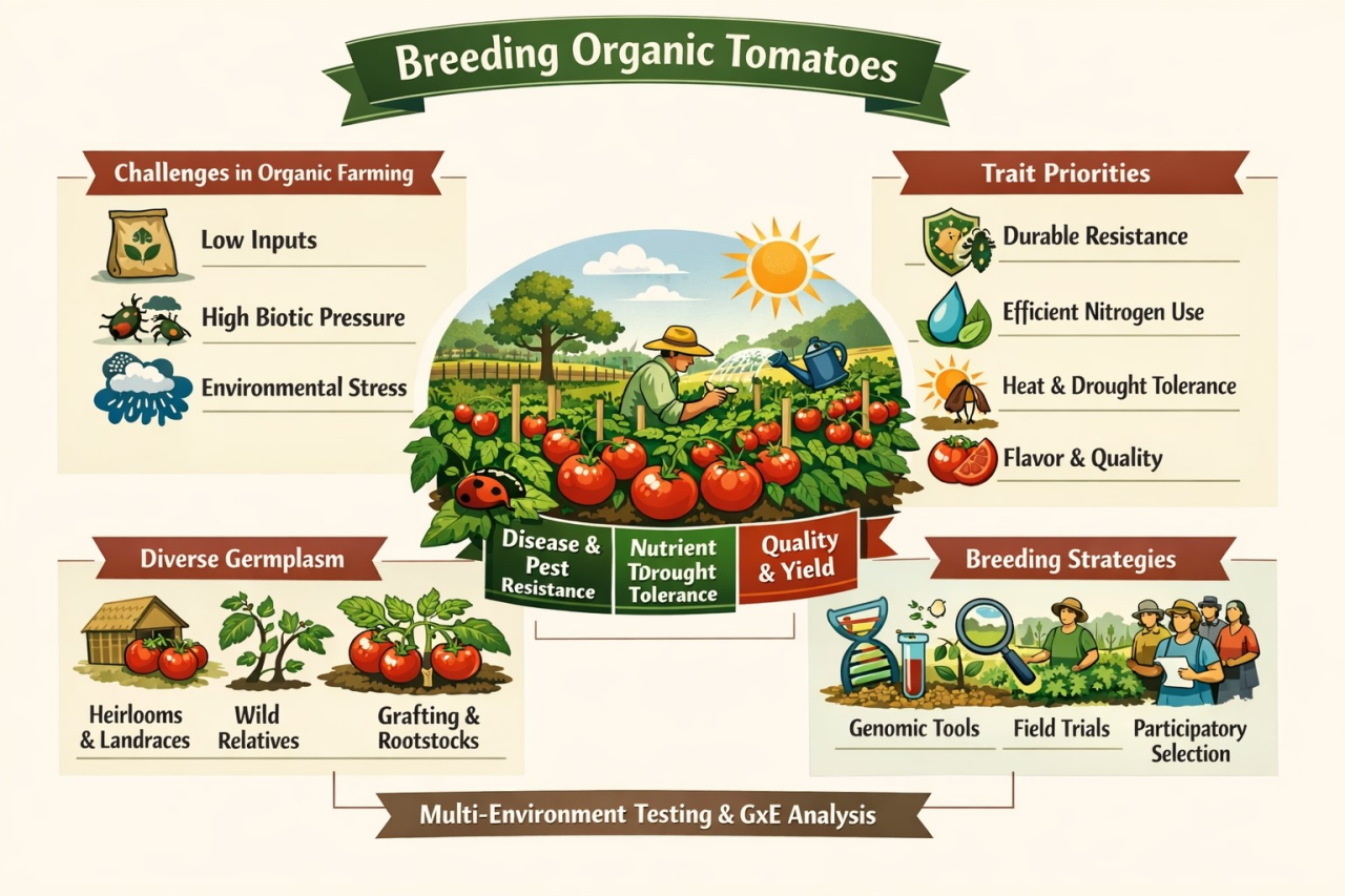 Organic tomato production imposes distinct selection pressures because yield and fruit quality must be sustained with limited soluble nutrient inputs, higher biotic pressure, and greater environmental variability than in conventional systems. This review examines how these constraints reshape breeding priorities and identifies breeding and evaluation strategies that align with organic management. Evidence was synthesized from peer-reviewed studies and publicly available breeding reports on organic and low-input tomato improvement, with emphasis on trait targets, germplasm sources, and trial designs. Analytical approaches used to quantify genotype, environment, and management effects including multi-environment testing and mixed-model analyses of genotype × environment interactions are summarized alongside phenotyping methods relevant to organic systems. Across the literature, recurring priorities include durable resistance to major diseases and arthropod pests; improved performance under organically derived nitrogen; enhanced water-use efficiency; weed competitiveness; tolerance to heat and drought; and maintenance of sensory, nutritional, and postharvest quality. Reported strategies emphasize broadening genetic diversity through landraces, heirlooms, and wild relatives; pre-breeding and introgression; grafting and rootstock improvement; and decentralized, participatory selection to capture local adaptation. Overall, the evidence supports evaluating germplasm directly in organic environments and combining rigorous field designs with emerging phenotyping and molecular tools to accelerate delivery of resilient, high-quality cultivars for diverse organic production systems.