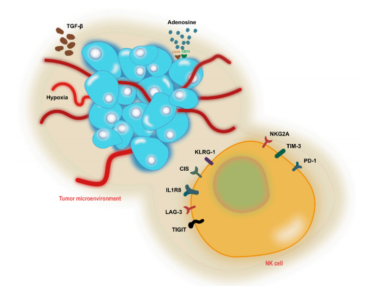 When a natural killer (NK) cell infiltrates a solid tumor, it is subjected to a variety of immunosuppressive and regulatory signals in the tumor microenvironment (TME) [1]. These signals originate from either soluble checkpoints or those expressed on cancer or immune cells, metabolites and the environment surrounding the cancer cells [2]. Nutrient and oxygen limitations characteristic of cancer microenvironments lead to dysfunction of NK cells. For instance, high rates of glycolysis inherent to cancer cells limit the ability of NK cells to participate in regular glycolytic fueling, severely impairing their effector functions, such as interferon-γ (IFN-γ) production and granzyme B expression [3]. This, in turn, drives changes in the metabolic states of NK cells which results in impaired anti-tumor immunity (Figure 1).
