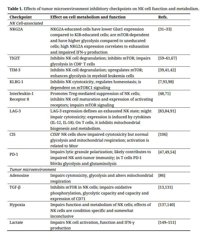 Table 1. Effects of tumor microenvironment inhibitory checkpoints on NK cell function and metabolism.