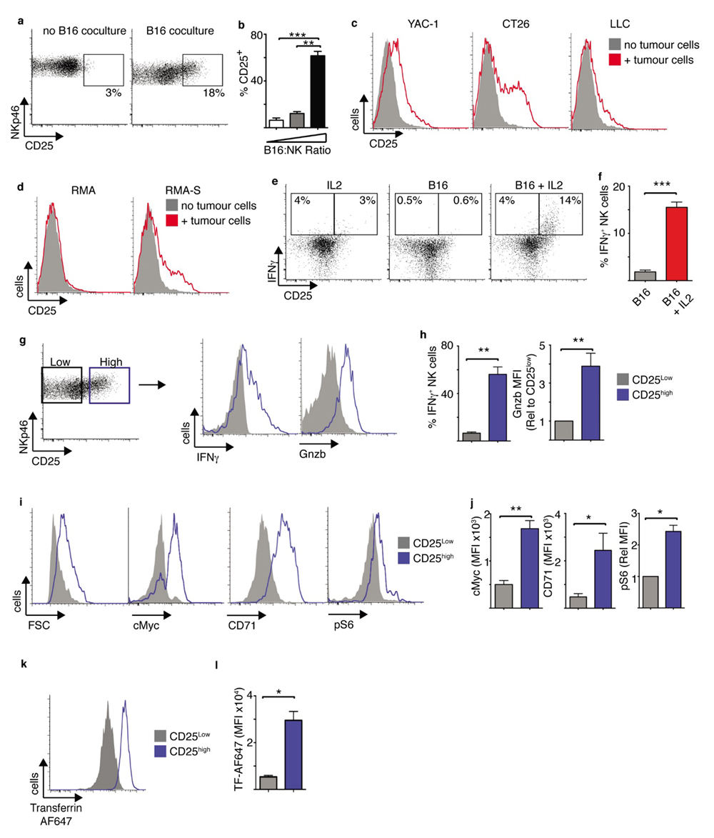 Figure 1. Tumour interactions induce CD25high NK cells with heightened metabolism and effector function. (a–d) Cultured NK cells (6 days in IL15 10 ng/mL) were purified and then co-cultured with or without B16 melanoma cells at an E:T ratio of 2:1 (a), with B16 melanoma cells at an E:T ratio of 4:1, 2:1 or 1:2 (b), with or without YAC-1, CT26 and LLC tumour cells at an E:T ratio of 1:4 (c), or with or without RMA/RMA-S cells at an E:T ratio of 1:4 (d) for 18 h before analysis of CD25 expression by flow cytometry. (e–k) Cultured NK cells (6 days in IL15 10 ng/mL) were purified and then co-cultured with B16 melanoma cells for 18 h at an E:T ratio of 2:1, washed and put back into culture with IL15 (7.5 ng/mL) with or without ± IL2 (20 ng/mL) for 18 h before analysis by flow cytometry. (e) IFNγ production by CD25high and CD25neg NK cells cultured in IL2 alone, with B16 cells or with B16 cells plus IL2. (f) IFNγ production in CD25high NK cells cultured with B16 ± IL2. (g,h) Analysis of NK cells cultured with B16 cells + IL2 comparing CD25high and CD25neg NK cells (g, left panel) for effector functions, IFNγ production and granzyme (Gnzb) B expression. (i,j) Analysis of cell size (FSC), cMyc and CD71 expression, and levels of phosphorylated S6 ribosomal protein (pS6) in CD25high and CD25neg NK cells from B16 cells + IL2 co-cultures. (k,l) Rates of fluorescent transferrin uptake were measured in CD25high and CD25neg NK cells from B16 cells + IL2 co-cultures. Data is representative (a,c,d,e,g,i,k) or mean ± SEM (b,f,h,j,l) of 3–5 independent experiments. Data was analyzed using a paired students t-test. (* p < 0.05, ** p < 0.01, *** p < 0.001).