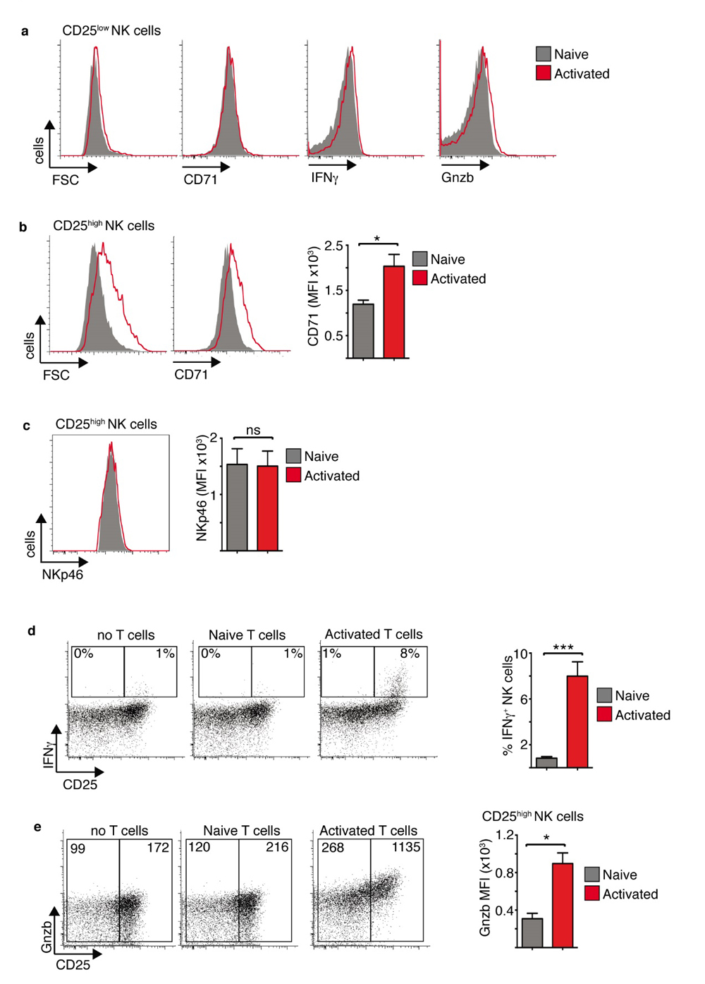 Figure 2. Activated T cells support increased metabolism and function of CD25high tumour interacting NK cells. Cultured NK cells (6 days in IL15 10 ng/mL) were purified and then co-cultured with B16 melanoma cells and purified T cells at NK:T:B16 ratio of 1:1:2. The T cells were either naïve or αCD3/αCD28-activated T cells. The NK cells were analysed by flow cytometry for cell size and CD71 (a,b), NKp46 expression (c) IFNγ production and Gnzb expression (a,d,e) in CD25low and CD25high NK cells as indicated. Data is representative (a–e) or mean ± SEM (b–e) of 4 independent experiments. Data was analyzed using a paired students t-test. (* p < 0.05, *** p < 0.001, ns non-significant).