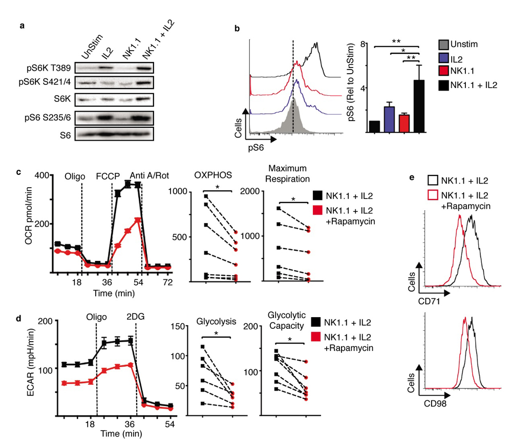 Figure 5. mTORC1 is required for NK1.1 plus IL2-induced NK cell metabolism. (a–e) Cultured NK cells (6 days in IL15 10 ng/mL) were purified and stimulated with a plate bound α-NK1.1 antibody (10 μg/mL) in media supplemented with low dose IL15 (5 ng/mL) ± IL2 (20 ng/mL) ± rapamycin (20 nM) as indicated, or left unstimulated (IL15; 5 ng/mL). Cells were analysed by immunoblot analysis (a), by flow cytometry for levels of phosphorylated S6 ribosomal protein (pS6) (b), or the expression of CD71 and CD98 (e). Alternatively, rates of OXPHOS (c) or glycolysis (d) were measured using the seahorse extracellular flux analyser. Data is representative (a–e) or mean ± SEM (b–d) of 5–6 independent experiments. Data was analyzed using a one way ANOVA and tukey post test (b), a paired students t-test (c,d) (* p < 0.05, ** p < 0.01).