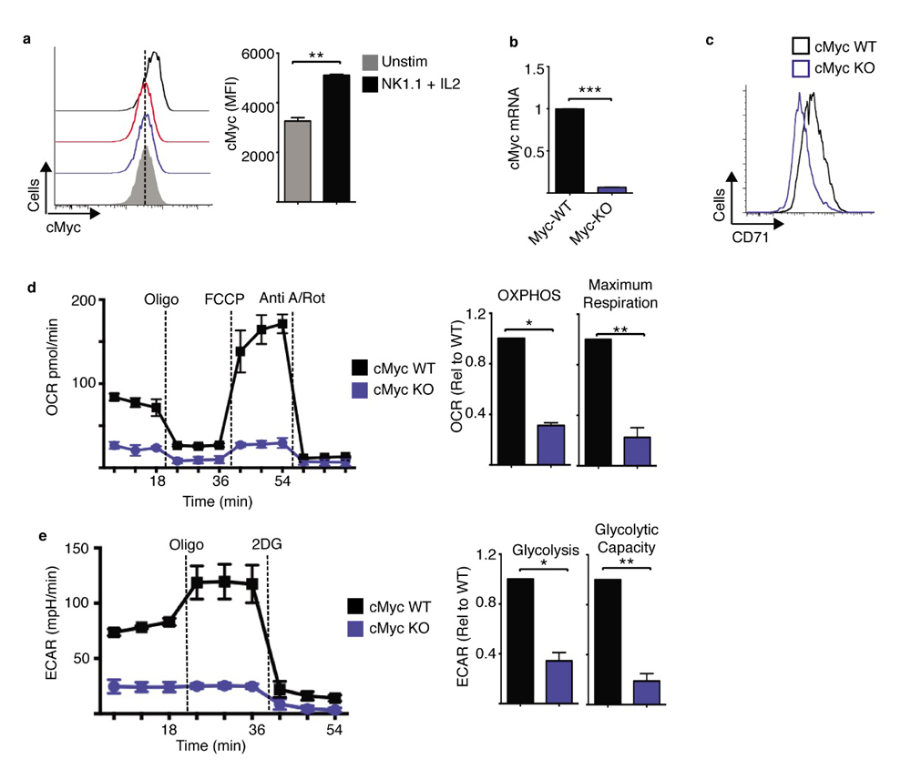 Figure 6. cMyc is required for NK1.1 plus IL2-induced NK cell metabolism. (a–e) Cultured (6 days in IL15 10 ng/mL) from cMycfl/fl Tamox-Cre and cMycwt/wt Tamox-Cre were treated with tamoxifen (0.6 μM) and were purified and stimulated with a plate bound α-NK1.1 antibody (10 μg/mL) plus IL2 (20 ng/mL) for 18 h. Cells were analysed by flow cytometry for cMyc and CD71 expression (a,c) or by quantitative rtPCR for cMyc mRNA expression (b). Alternatively, rates of OXPHOS (d) or glycolysis (e) were measured using the seahorse extracellular flux analyser. Data is representative (a,c,d,e) or mean ± SEM (a,b,d,e) of 3 independent experiments. Data was analyzed using a students t-test (a) or a one sample t-test against a theoretical value of 1 (b,d,e) (* p < 0.05, ** p < 0.01).