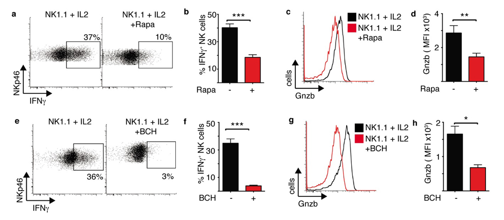Figure 7. mTORC1 and cMyc are required for NK1.1 plus IL2-induced NK cell effector functions. (a–h) Cultured NK cells (6 days in IL15 10 ng/mL) were stimulated with a plate bound α-NK1.1 antibody (10 μg/mL) plus IL2 (20 ng/mL) ± rapamycin (20 nM) (a,d) or ±BCH (25 mM) (e–h) as indicated. Cells were analysed by flow cytometry for the production of IFNγ (a,b,e,f) or granzyme B expression (c,d,g,h). Data is representative (a,c,e,g) or mean ± SEM (b,d,f,h) of 3–6 independent experiments. Data was analyzed using a paired students t-test (* p < 0.05, ** p < 0.01, *** p < 0.001).