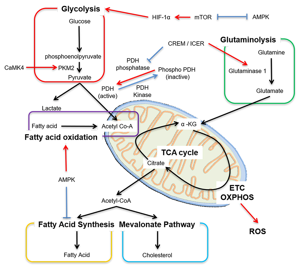 Figure 1. Main metabolic pathways in T cells. Cellular metabolism is controlled by many factors, including transcription factors. Red arrow means “enhance or activate”, whereas blue line means “inhibit or inactivate”. Acetyl Co-A, acetyl coenzyme A; mTOR, mammalian target of rapamycin; AMPK, adenosine monophosphate activated protein kinase; HIF-1α, hypoxia inducible factor 1 alpha; PKM2, pyruvate kinase muscle isozyme 2; CaMK4, calcium/calmodulin–dependent protein kinase IV; PDH, pyruvate dehydrogenase; ICER, inducible cAMP early repressor; α-KG, α-ketoglutarate; ETC, electron transport chain; OXPHOS, oxidative phosphorylation; ROS, reactive oxygen species.