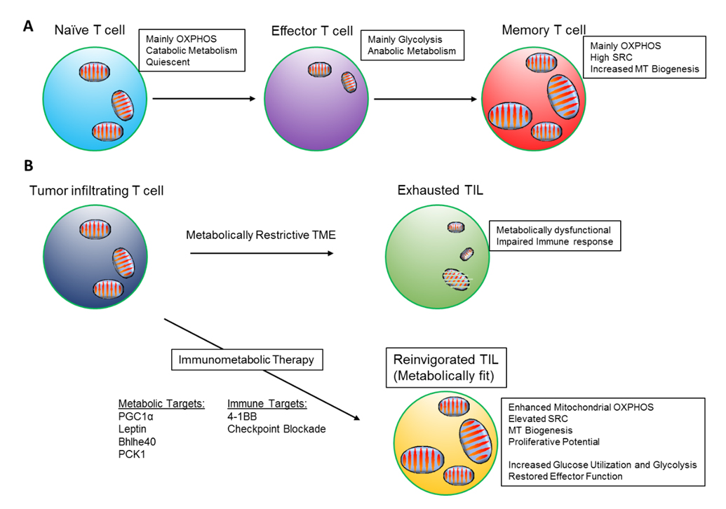 Figure 1. Mitochondrial metabolism supports T cell responses. (A) Metabolic states of naïve, effector and memory T cells. (B) Dysfunctional metabolism in exhausted TILs with loss of mitochondrial fitness. Potential molecular targets to be activated or overexpressed to reinvigorate mitochondrial metabolism and to enhance anti-tumor function.