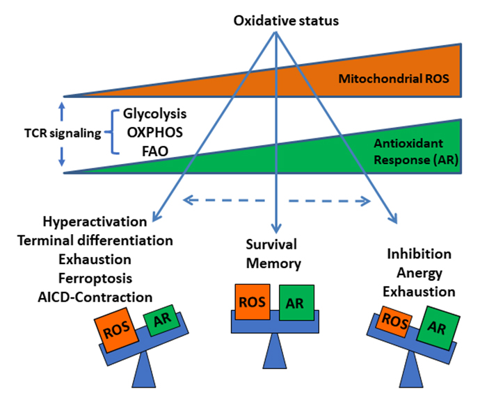 Figure 3. Metabolic balance of T cell function and differentiation. Glycolysis, OXPHOS and FAO are tightly connected with ROS metabolism. TCR signaling simultaneously increases ROS levels and antioxidant responses. Modulating T cell metabolism alters ROS production and redox state with distinct effects on T cell activation, anergy and apoptosis, while antioxidant response (AR) halts T cell responses. ROS levels that exceed the protective capacity of antioxidant response may result in T cell hyperactivation and AICD or ferroptosis associated with cell contraction. Moderate ROS levels in turn are associated with T cell longevity and memory differentiation. Low ROS response levels are associated with T cell hypo-responsiveness and exhaustion.