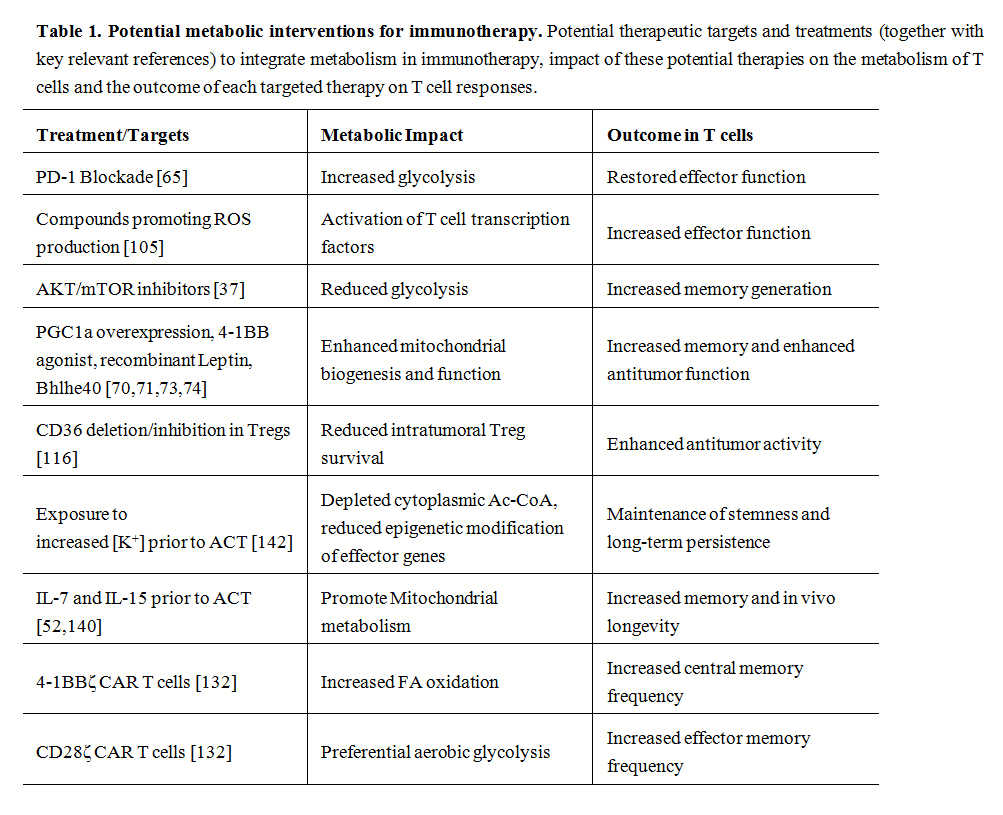 Table 1. Potential metabolic interventions for immunotherapy. Potential therapeutic targets and treatments (together with key relevant references) to integrate metabolism in immunotherapy, impact of these potential therapies on the metabolism of T cells and the outcome of each targeted therapy on T cell responses.