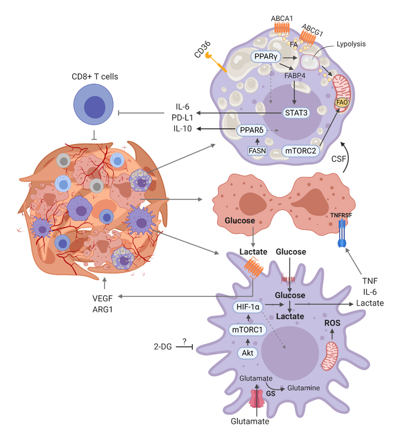 Regarding fatty acid metabolism, it was shown that pharmacological FAO inhibition favors an antitumorigenic polarization in TAMs from colorectal cancer [76]. Indeed, FAO has important effects on the induction of immunosuppressive TAMs. Recently, Wu et al. observed that lipid droplet-dependent FAO triggers an immunosuppressive TAM phenotype through mTORC2 [77]. Yet in myeloid cells, fatty acid synthase (FASN) is upregulated as a consequence of colony stimulating factor 1 (CSF1), secreted by lung cancer cells [78]. Interestingly, IL-10 secretion is dependent on PPARδ, however PPARδ activation is blocked when FASN is knocked down in myeloid cells, implying that endogenous ligands derived from FASN in myeloid cells can be a key regulator of PPARδ activity in the context of tumor myeloid cells [78]. In recent studies, TAMs infiltrating early human breast cancers display high expression of fatty-acid binding protein (FABP)5, which associates with lipid droplet accumulation. At this stage, TAMs present an anti-tumoral phenotype through secretion of IFN-I. In the late stages, infiltrating macrophages express FABP4, which supports tumor progression by favoring IL6/STAT3 signaling [79].