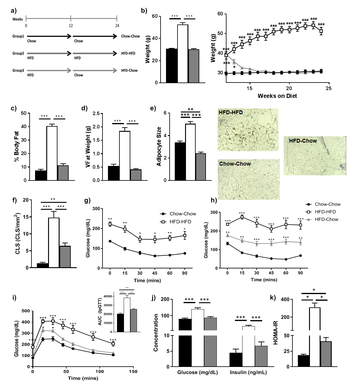 Figure 1. Effect of various diets on (a) C57/Bl6 mice at 24 weeks post-diet (n = 5/group) on (b) body mass, (c) adiposity, (d) weight of visceral fat at the time of sacrifice, (e) adipocyte size with representative H&E stained histological slides and (f) crown-like structures. Further metabolic analysis examined insulin sensitivity and glucose tolerance using the intraperitoneal insulin tolerance test with comparison to the chow-chow group for statistical analysis (g) prior to and after (h) diet change, (i) intraperitoneal glucose tolerance test with comparison to the chow-chow group for statistical analysis with associated area under the curve (AUC), and (j) circulating insulin and glucose and (k) HOMA-IR. * p < 0.05, ** p < 0.01, or *** p < 0.001.