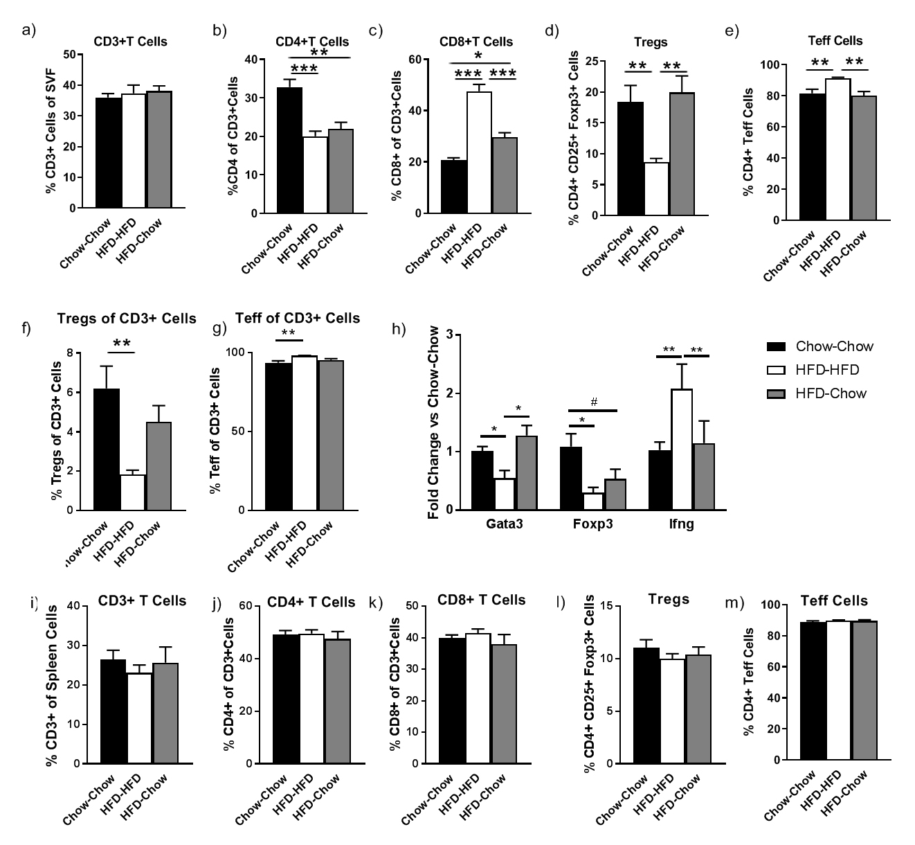Expression of Ifnγ, produced by CD8+ and CD4+ Th1 cells increased in the HFD-HFD animals in bead-isolated CD3+ T cells from SVF and returned to chow-chow levels with weight loss. In contrast, Gata3, the primary marker of Th2 T cells trended to decrease with HFD and increased after the switch to a chow diet (Figure 2h). However, the expression of Foxp3, a marker of Tregs, decreased with HFD but did not return to chow-chow levels with weight loss (Figure 2h) consistent with the Treg flow analyses (Figure 2f). No differences between T cell populations were noted in the spleen (Figure 2i–m), suggesting no changes in peripheral T cells among the diet groups.