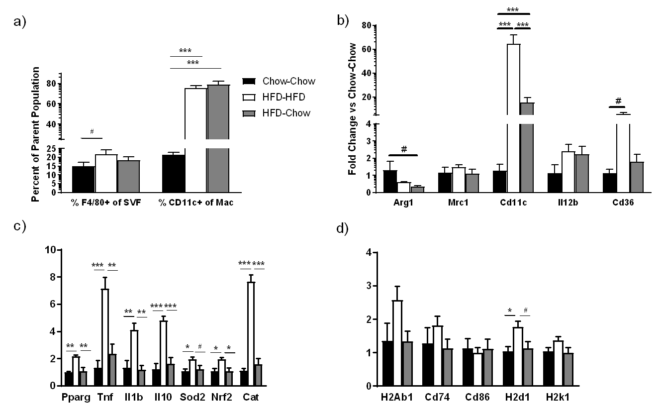 Cd11c+ Macrophages Remain Elevated despite Weight LossCd11c (Itgax) is considered a marker of M1-like macrophages in mice, while Arg1 and Mrc1 are markers of phagocytic M2-like macrophages [13]. Flow analyses revealed that macrophage abundance increased in SVF of HFD-HFD vs. chow-chow mice (Figure 3a), but was not different between HFD-HFD and HFD-chow mice. The %CD11c macrophages markedly increased in HFD-HFD vs chow-chow SVF and remained elevated in HFD-chow SVF suggesting a persistence of the inflammatory M1-like state. This observation was supported by gene expression of the bead-isolated ATMs; Itgax (Cd11c) expression increased during HFD-HFD and decreased in the HFD-chow group, but remained substantially above chow-chow levels (Figure 3b). Mrc1 expression did not change, whereas Arg1 trended to decrease in the weight loss mice. Thus, M2-like macrophage markers do not increase and M1-like markers do not decrease to lean values following weight loss. However, expression of genes related to cytokines (Tnf, Il1b, Il10) and oxidative stress (Nrf1, Sod, Cat), and Pparγ, all increased during HFD-HFD and decreased during HFD-chow (Figure 3c). Lastly, we assessed genes involved in adaptive (H2Ab1, Cd74, Cd86) and innate immunity (H2d1, H2k1). There was a trend for major histocompatibility complex I and II (MHCI/II) genes (H2Ab1, CD74, H2k1) to increase with HFD and decrease during HFD-chow which was significant for H2d1 (Figure 3d). Thus, ATM normalization of cytokine and antigen presentation genes occurs with weight loss.