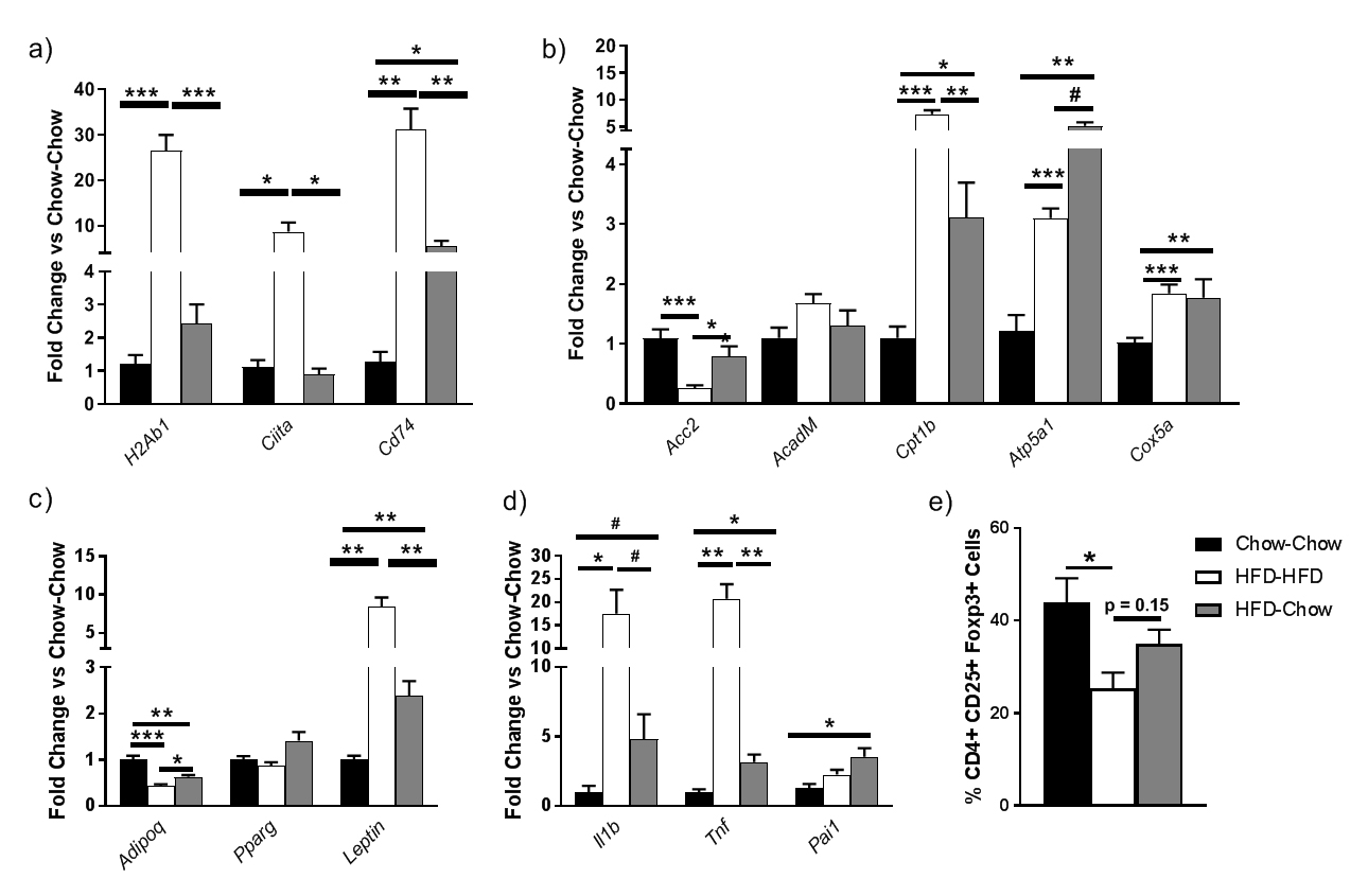 Figure 5. Effect of various diets on C57/Bl6 mice (n = 5/group) at 24 weeks post-diet on visceral adipocyte gene expression for genes related to (a) the MHCII pathway, (b) metabolism, (c) adipokines and (d) inflammation. For further analysis, VAd cells were isolated 24 weeks post-diet (n = 5/group) and were co-cultured with splenic naïve CD4 T cells from transgenic OTII mice for four days in triplicates in the presence of OVA peptide, IL2 and TGFbeta to stimulate Treg differentiation. T cells were then collected and subjected to (e) flow cytometry analyses. # p < 0.10, * p < 0.05, ** p < 0.01, or *** p < 0.001.