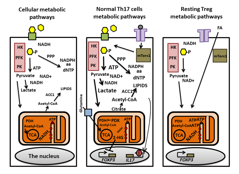 Figure 1. A general overview of metabolic pathways and pathways selectively induced in Th17 and Treg lymphocytes. Basic metabolic pathways involved in generating ATP are shown in the left figure. Glucose (yellow hexagons) enters the cytoplasm through GLUT1 (green boxes) and is metabolized by the glycolysis pathway (purple boxes). HK, PFK and PK modify substrates irreversibly generating pyruvate and NAD+. Pyruvate can be converted to lactate to re-generate NADH for further glycolysis. Metabolites derived from glucose can also be used in the PPP which generates precursors for aa,dNTP and NADPH. Pyruvate entering the mitochondria is used as a substrate for the TCA cycle. PDH converts pyruvate to acetyl-CoA that is, subsequently, metabolized to generate NADH and FADH2 (the latter not shown). TThe electron transport chain (red circles inside the mitochondria) is located in cristae in the mitochondrial inner membranes. NADH and FADH2 are used in OXPHOS to generate ATP. Acetyl-CoA, is converted to citrate and exported from the mitochondria, is then carboxylated byACC1 and used for lipid synthesis. Th17 cell metabolism (middle figure) involves engagement of the TCR and subsequent activation of the glycolysis promoting mTORc1. Mitochondrial import of pyruvate is restricted due to high level of the PDH-deactivating PDK. ACC1 utilizes citrate and generate precursors for lipid synthesis in Th17 cells. Sterols generated from lipid precursors are ligands augmenting RORγt in the cells. The TCA cycle and OXPHOS rely on imports of glutamine (blue box; glutamine transporter SLC1A5), which is metabolized to generate the TCA cycle metabolite α-ketoglutarate. During this process, 2-HG is generated, which in turn can inhibit transcription of the FOXP3 gene, thereby, preventing transdifferentiation of Th17 cells to Tregs. The metabolism of resting Tregs is distinct from Th17 cells’ (right). Tregs rely on the uptake of external fatty acids (FA) and FAO for OXPHOS dependent ATP generation and for the generation of aa and dNTP precursors.