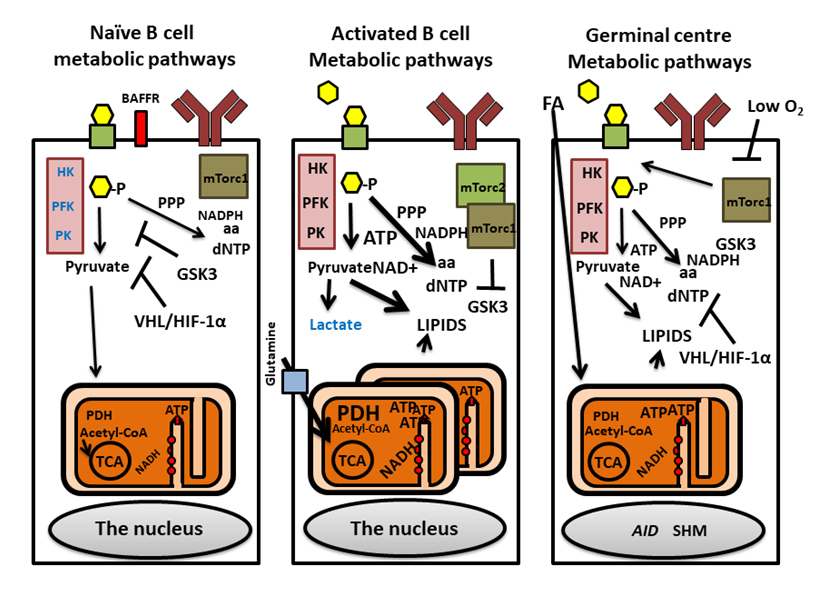 2-HG: 2-hydroxyglutarate; aa: amino acid; Acetyl-CoA: Acetyl Coenzyme A; ACC: acetyl-CoA carboxylase; AID: Activation-induced cytosine deaminase; AhR: Aryl-hydrocarbon receptor; ALDA: Aldolase A; AMP: Adenosine monophosphate; AMPK: Adenosine monophosphate-Activated kinase; Atg7: Autophagy related 7; ATP: adenosine triphosphate; BAFFR: B cell receptor; BCR: B cell receptor; dNTP: deoxynucleoside triphosphate; Drp1: dynamin-related protein 1; FADH2: Flavin adenine dinucleotide; FAO: Fatty acid oxidation; GC: Germinal center; GLUT1: Glucose transporter 1; GSK3: Glycogen synthase kinase 3; GTP: Guanidine triphosphate; HIF-1α: Hypoxia induced factor 1α; HK: Hexokinase; NAD+/NADH: Nicotinamide adenine dinucleotide; mTOR: Mammalian target of rapamycin; OXPHOS: oxidative phosphorylation; PDH: Pyruvate dehydrogenase; PDP2: PDH phosphatase subunit 2; PDK1: Pyruvate dehydrogenase kinase; PFK: Phosphofructokinase; PI3-K: Phosphoinositide-3-OH kinase; PK: Pyruvate kinase; PKCβ: Protein kinase Cβ; PP2A: Protein Phosphatase 2A; PPP: Pentose phosphate pathway; Raptor: Rapamycin-associated TOR protein; Rictor: Rapamycin-insensitive companion of mTor; ROS: reactive oxygen species; SHM: Somatic hyper mutations; Sirt1: Sirtuin-1; STIM1: Stromal interaction molecule 1; TCA: tricarboxylic acid cycle; TCR: T cell receptor; VHL: von Hippel-Lindau