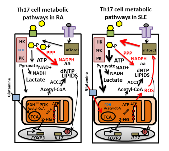 Figure 3. Altered metabolic pathways in Th17 cells from patients with rheumatoid arthritis (RA) and systemic lupus erythematosus (SLE). Main metabolic pathways are altered in Th17 cells in RA and SLE compared with healthy individuals (red arrows). In RA Th17 cells, PFKFB is upregulated resulting in reduced activity of glycolysis (purple box with enzymes HK, PFK and PK) enzymes PFK (blue color). Excessive amounts of glucose (yellow hexagons) are, therefore, shunted through the PPP rendering the cells to be in a reductive state with high levels of NADPH. The cells develop an inflammatory senescence phenotype leading to high level production of IL-17, TNFα and IFNγ. Th17 cells in SLE display increasd glycolysis and OXPHOS and enlarged mitochondria. Signaling through mTORC1 (green box) induces glycolysis and increases PPP output. Increased ROS generated during OXPHOS (electron transport by complexes (red small circles)) further activates mTORC1. PDH is suppressed in SLE Th17 cells and the TCA cycle relies on glutamine import (glutamine transporter SLC1A5: blue box). GLUT1: green boxes on the membrane with black borders; TCR: violet T shaped boxes on the membrane.