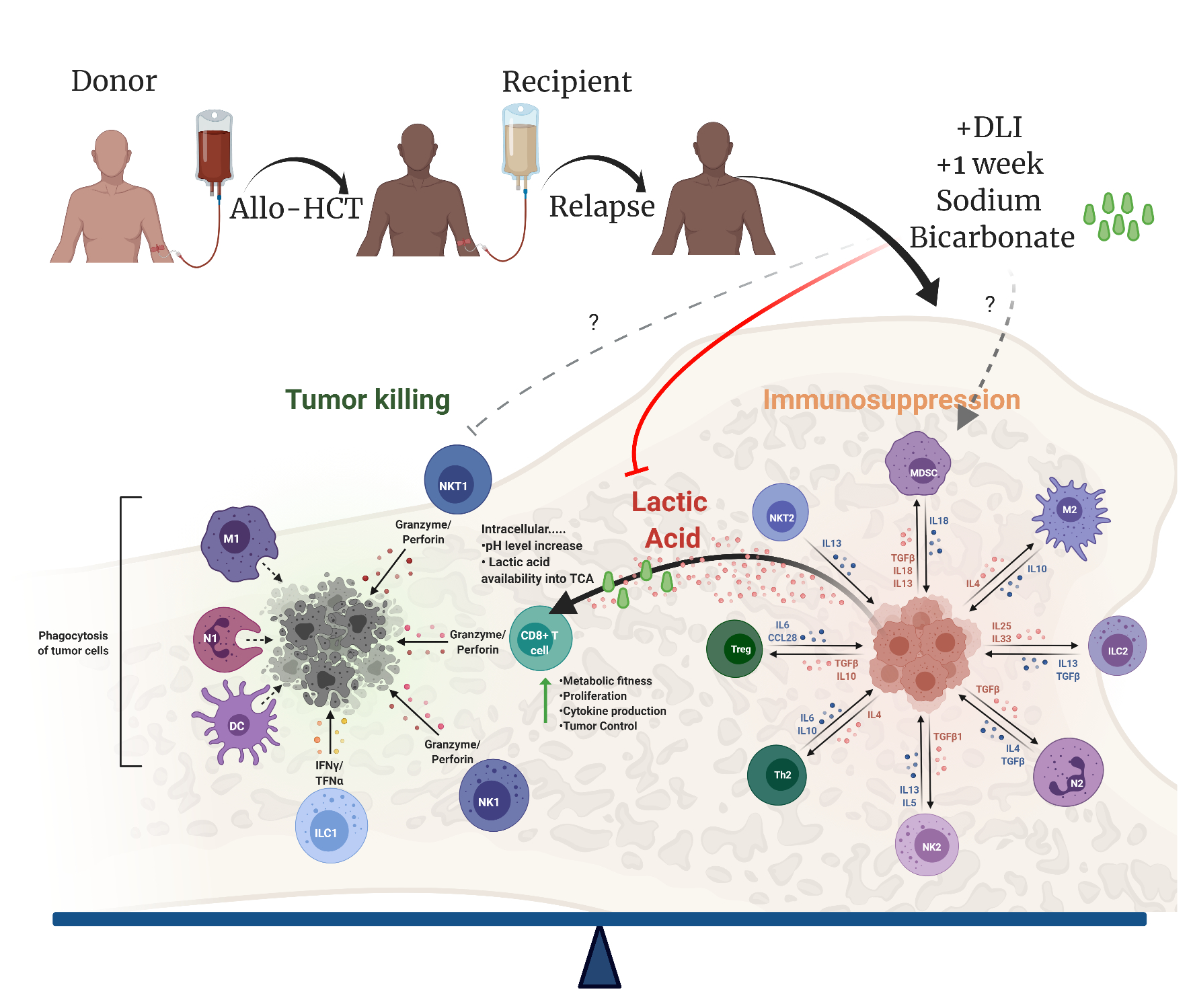 In conclusion, the study of Uhl et al. highlights the importance of relapse in AML following allo-HCT. They present compelling data that provide a pharmacological strategy to enhance GvL effects in patients relapsing following allo-HCT. The data shows that treatment using sodium bicarbonate overcomes metabolic reprogramming of transferred T cells to improve tumor control (Figure 1). It is interesting to speculate that in the right context, treatment with sodium bicarbonate or agents that improve immune metabolic fitness may augment current therapies such as CAR-T [16], checkpoint inhibition [17], or blockade of immunosuppressive “don’t eat me signals” [18] and ultimately further improve AML patient outcome.