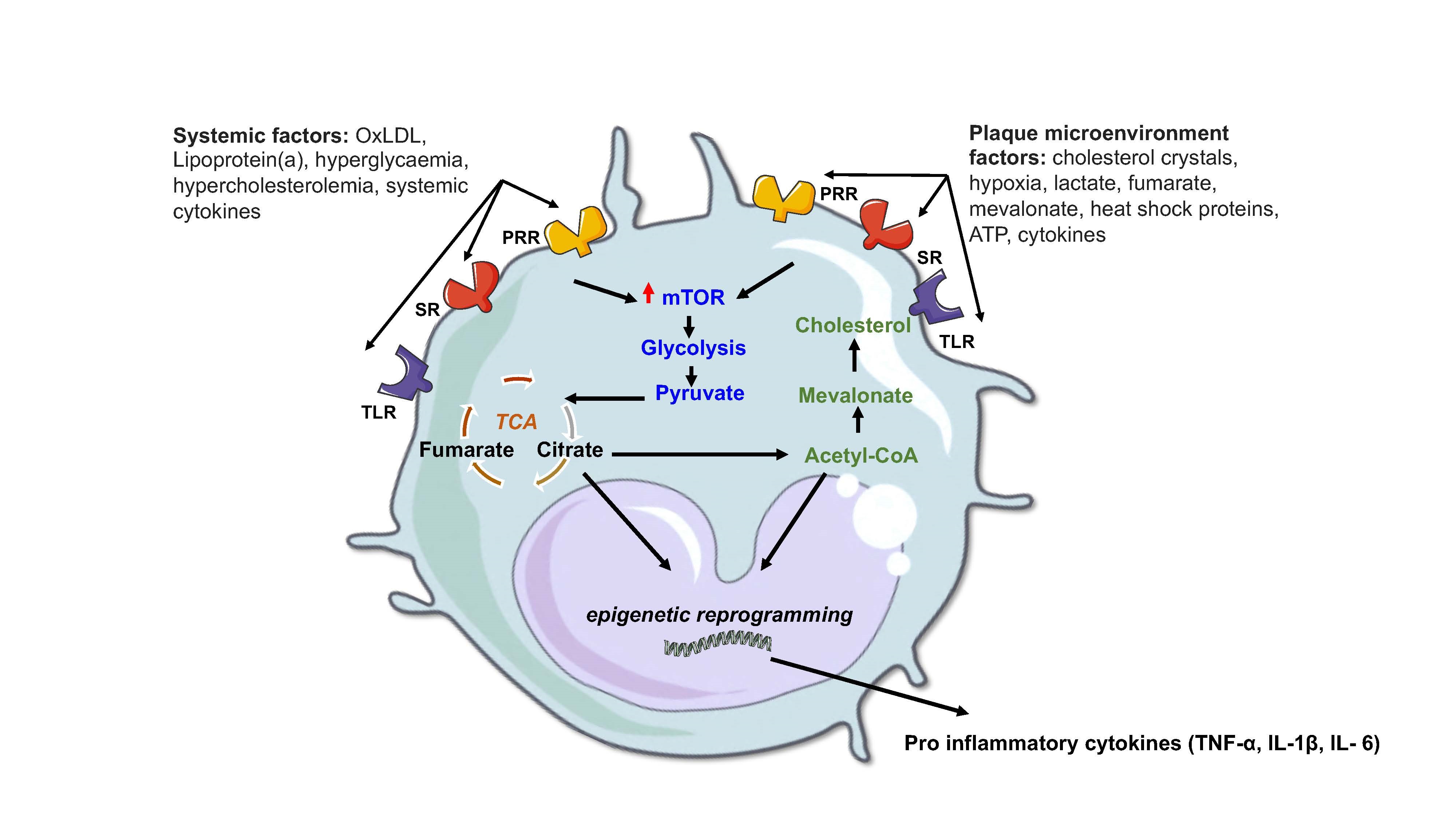 Figure 1. Atherosclerotic factors that modulate innate immune metabolic pathways. Pro atherogenic stimuli, either systemic or localized to the plaque microenvironment, engage with specific receptors such as pattern recognition receptors (PRR), toll-like receptors (TLR) and scavenger receptors (SR) in innate immune cells to induce a state of trained immunity associated with driving disease progression. This trained immunity involves an interplay between an increase in metabolic pathways such as glycolysis, a fragmented TCA cycle and cholesterol synthesis which lead to epigenetic reprogramming and enhanced gene transcription of disease associated cytokines as described in the text. Figure created using Servier Medical Art under a CC-BY Creative Commons license, smart.servier.com.
