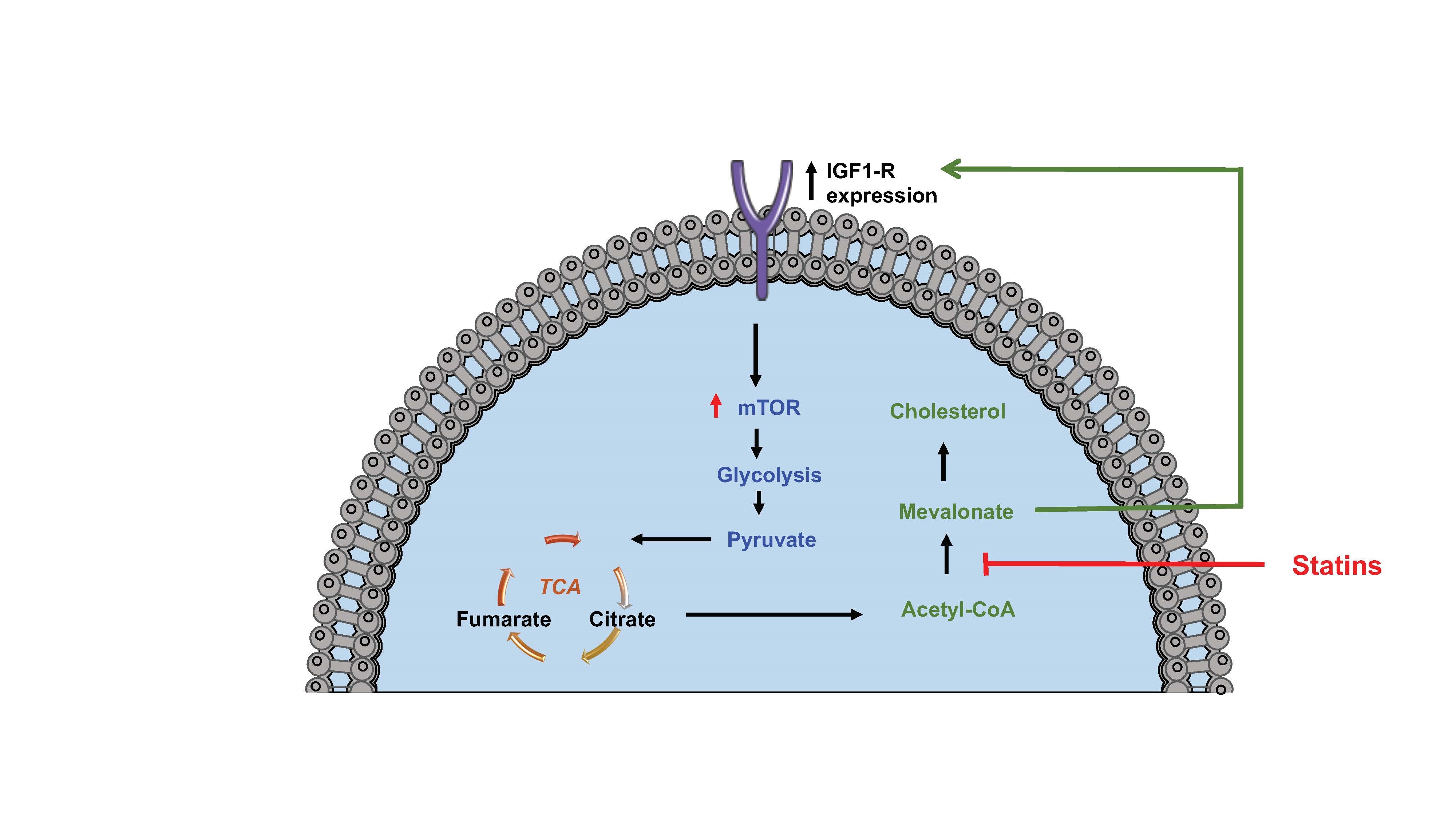 Figure 2. Statins inhibit glycolysis in monocyte trained immunity. Blocking cholesterol synthesis using statins inhibits the production of mevalonate which is a driver of IGF1-R expression induced aerobic glycolysis and trained immunity. Figure created using Servier Medical Art under a CC-BY Creative Commons license, smart.servier.com.