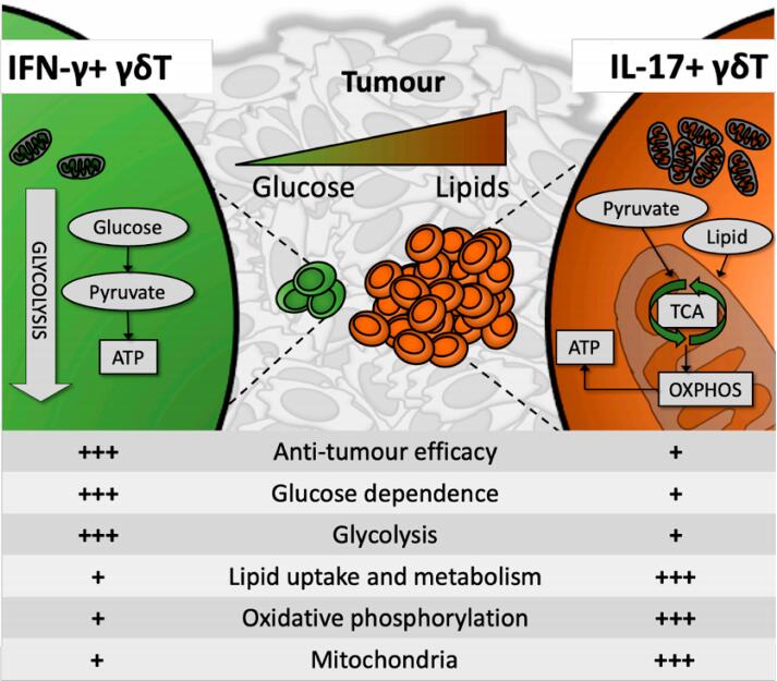 Figure 1. Anti-tumorigenic IFN-γ-producing γδT cells (γδIFN) contained few mitochondria and were highly glycolysis-dependent, preferentially persisting and thriving in a glucose-high environment. In contrast, IL-17-producing γδT cells presented with high mitochondrial mass, were preferentially reliant on oxidative metabolism and utilized lipids for energy synthesis. This has potentially significant implications for anti-tumour γδIFN efficacy inside the lipid-rich, glucose-poor solid tumour microenvironment.