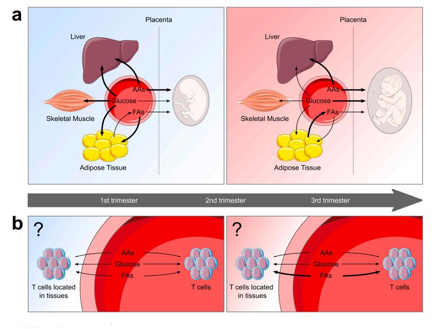 The influence of cellular metabolism on leukocyte phenotype and function is an increasingly exciting area of immunology. Mechanisms underpinning immune plasticity in pregnancy such as enhanced activity of suppressive or regulatory immune cells and increasing susceptibility of pregnant women to severe responses to some viral infections such as influenza are unknown. Immunometabolism might provide a framework for understanding these dynamic adaptations from pre-conception, through pregnancy and into the postpartum. Although maternal metabolic changes are established in many tissues, it is unknown what effect if any there is on immune cells [26]. This review aims to focus on changes to T cells, especially the regulatory T (Treg) cell and T helper (Th)2 cell biased responses that characterise pregnancy and how changes in maternal energy substrate utilisation might link to changes in the activity of these cells during pregnancy.