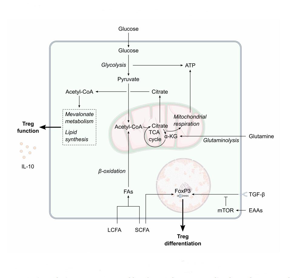 Figure 2. The potential effect of maternal metabolism on Treg differentiation and function. Decreased extracellular amino acids concentrations combined with increased transforming growth factor-β concentrations during pregnancy would enhance the FoxP3-mediated regulatory T cell (Treg) differentiation. Short-chain fatty acids amongst the increased maternal extracellular fatty acid pool would also enhance Treg differentiation. Increased circulating fatty acid concentrations could increase the availability of cellular acetyl-coA. Flux of acetyl-coA through mevalonate metabolism and lipid synthesis is vital for Treg function, such as interleukin-10 (IL-10) production, and Treg survival. α-KG, α-ketoglutarate; EAAs, essential amino acids; FA, fatty acid; IL-10, interleukin-10; LCFA, long-chain fatty acid, mTOR, mechanistic target of rapamycin; SCFA, short-chain fatty acid; TCA, tricarboxylic acid; TGF-β, transforming growth factor-β; Treg, regulatory T cell.