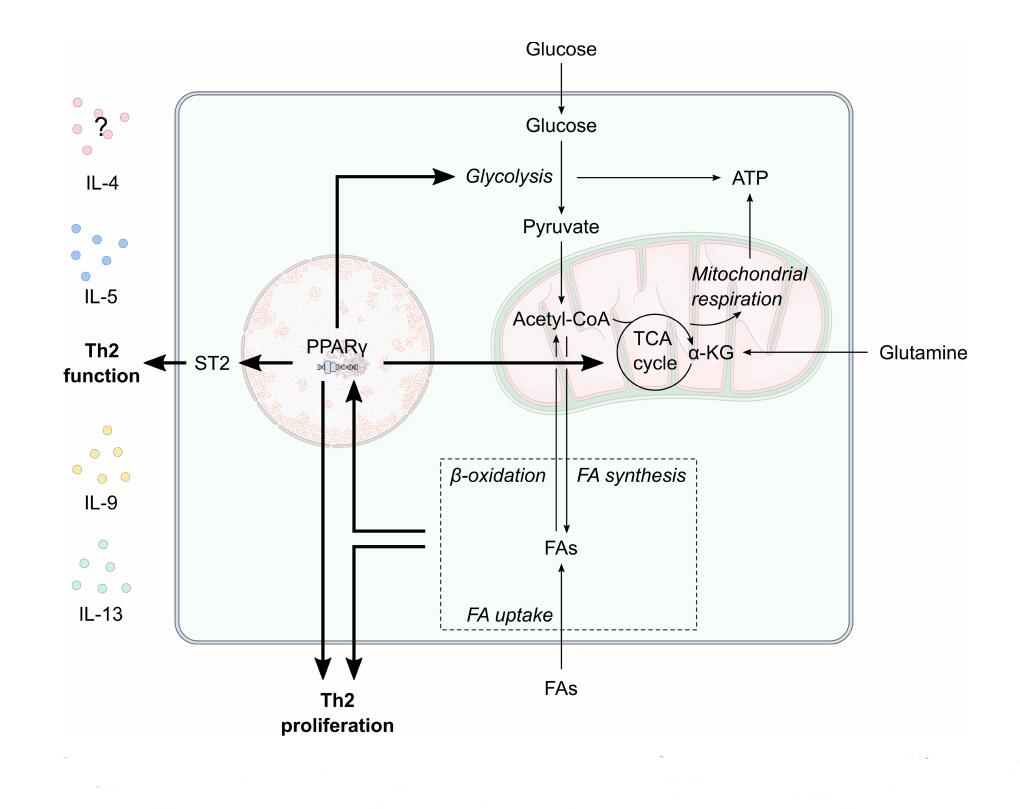 Peroxisome proliferator-activated receptor (PPAR)γ—the master regulator of lipid metabolism and storage—entwines cellular metabolism with Th2 effector function. PPARγ inhibition inflicted the same metabolic and functional effects on CD4+ T cells as ACC1 inhibition, suggesting that PPARγ-mediated metabolic reprogramming directs the activation of Th2 cells [106]. Gene expression analysis has revealed that activated Treg cells are enriched in genes associated with lipid metabolism [107]. There are more PPARγ binding sites on open chromatin at loci that facilitate enhanced expression of the lipid-associated target genes needed for glucose metabolism and promoting Th2 functions such as recruitment of eosinophils to inflamed airways [107]. Included in the target genes for PPARγ binding are IL-5 and IL-13, and key Th2 transcription factor GATA3 [108]. Th2 cells lacking PPARγ failed to mount a Th2 response to allergic challenge in the airways of mice [109]. PPARγ deletion reduced the production of IL-5 and IL-13 by Th2 cells and reduced the presence of eosinophils and mucus-secreting goblet cells, culminating in an impaired pathogenic response [109]. Similar responses were also seen in other mouse models of allergic airway inflammation and H. polygyrus infection [109,110], emphasising the importance of PPARγ in protective immunity. IL-33 plays a critical role in PPARγ signalling in Th2 cells. IL-33R ligation upregulates the expression of PPARγ, which itself can upregulate the expression of IL-33R subunit ST2, creating a positive feedback loop [109,110].