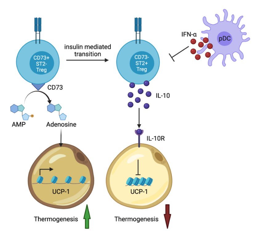 Figure 1. Schematic of VAT resident Treg differentiation, survival, and regulation of adipocyte thermogenesis. Newly published data have shown that Tregs enter VAT as CD73+ ST2 cells and that insulin signaling initiates differentiation of these cells to CD73 ST2+ VAT resident Tregs. Blimp-1 driven IL-10 secretion by ST2+ VAT Tregs was shown to repress adipocyte thermogenesis while adenosine conversion by CD73+ VAT Tregs was shown to promote adipocyte thermogenesis. Under high fat diet conditions leading to diet induced obesity (DIO), it was revealed that ST2+ VAT Tregs are susceptible to IFN-α secretion by plasmacytoid dendritic cells (pDCs) which promotes VAT Treg death and represses proliferation.