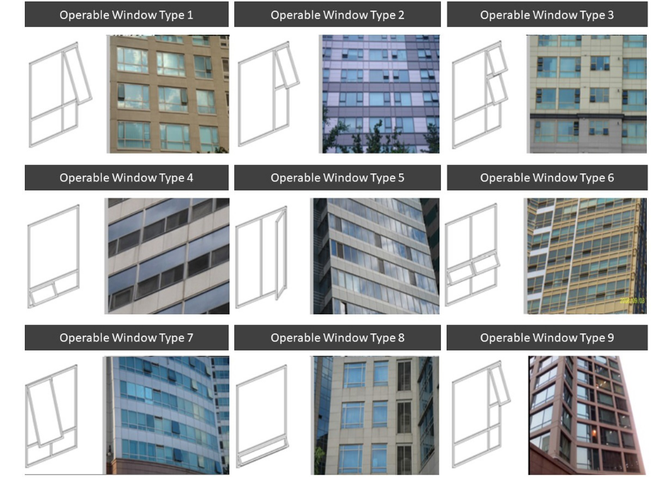 A study on the physical and psychological health of building occupants in super tall residential buildings of South Korea indicates that indoor ventilation performance and acoustical comfort are regarded as the most critical factors, followed by other environmental requirements such as daylight, views, and indoor temperature and humidity [17]. As for naturally-ventilated building façades for natural ventilation improvement, several operable window types were investigated from a survey of 114 high-rise buildings in South Korea, as shown in Figure 1. A simulation study states that pull-down and casement-in windows improved natural ventilation performance more than project-out windows. This study concludes that window opening direction for wind-induced natural ventilation is more effective than window opening size [18]. This study places the attention how operable windows with potentially poor acoustic sound insulation can improve natural ventilation performance and noise transmission loss by acoustically-treated ventilation openings.