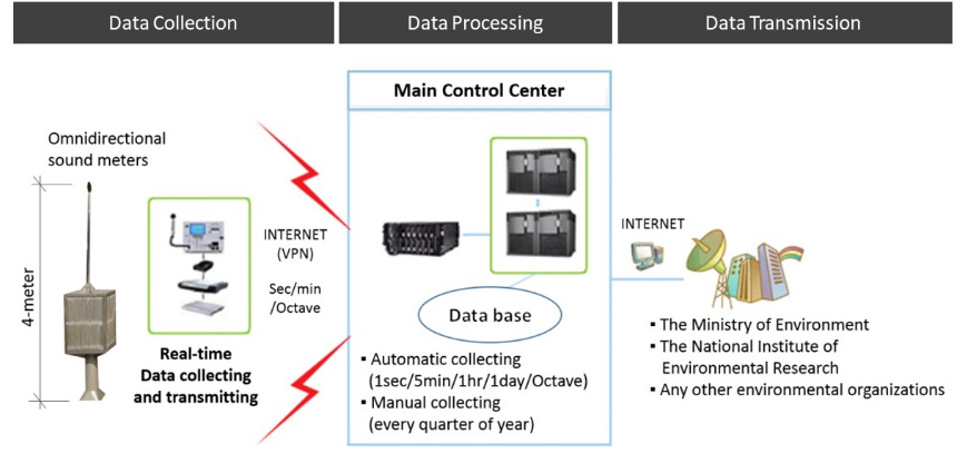 Data CollectionThe purpose of the quantitative data collection is that LAeq is one of several significant parameters, defining the degree of noise annoyance. The study quantified the degree of noise annoyance based on sound pressure levels (SPL) in dB, showing that two variables are proportional [11]. National Noise Information System of Korea (NNISK) monitors the omnidirectional sound meters to collect the real-time data of LAeq measured at 4 meters high from the ground level without any obstacles, as shown in Figure 3. The collected real-time data of LAeq are transmitted to the main control center on a regular time cycle. The Ministry of Environment and other national environmental institutes utilize these data for environmental policymaking for the Seoul metropolitan area.