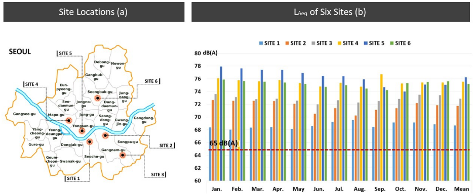 The A-weighted equivalent continuous sound levels (LAeq) collected from the omnidirectional sound meters at six sites of the Seoul metropolitan area exceeded the noise thresholds that could potentially cause noise annoyance and sleep disturbance during day-time and night-time. The measured annual LAeq was higher than environmental noise level standards to be lower than 65 dB(A) and 55 dB(A) for each day-time (06:00 AM to 10:00 PM) and night-time (10:00 PM to 06:00 AM) period. This numerical data implies that building occupants have been consciously and unconsciously exposed to unacceptable noise levels for a long-term period that potentially causes adverse health effects due to noise.