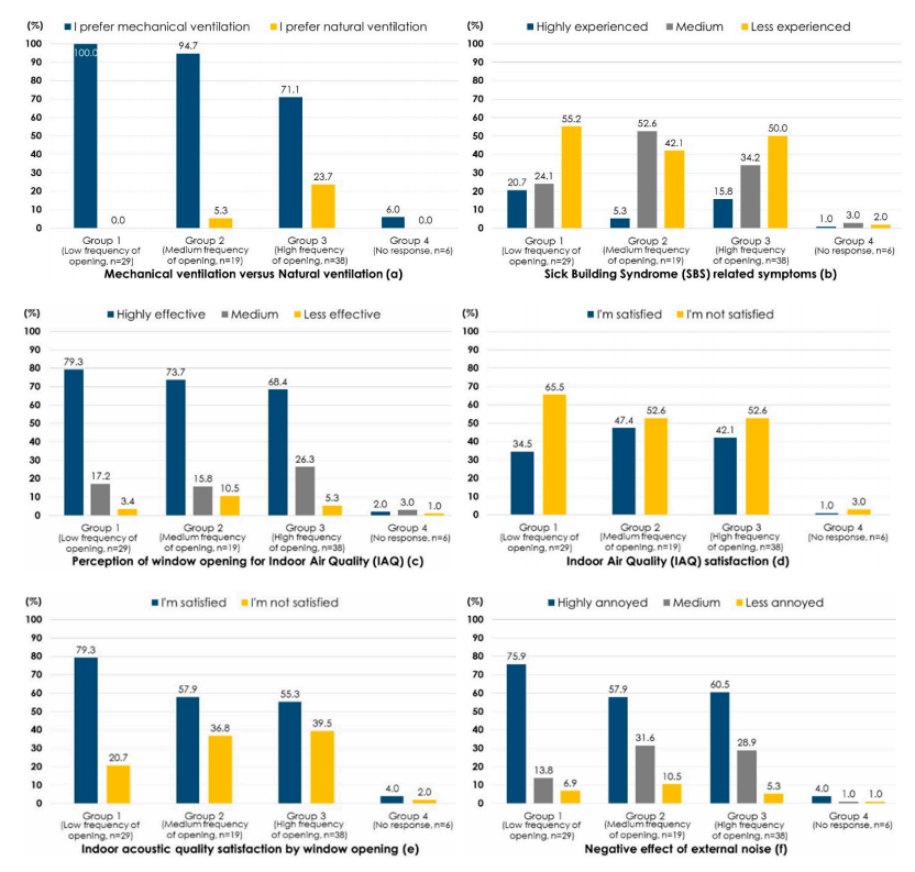 Statistical analysis from questionnaire responses results that mechanical ventilation systems were dominantly used across three groups in Figure 6a. There was a slight percentage difference in experiencing SBS related symptoms among Groups 1, 2, and 3 in Figure 6b. Respondents in Group 1 who seldom or never open windows experienced fewer SBS related symptoms by 3 to 5% compared to Groups 2 and 3 who sometimes, often, and always open windows 1. However, it was also found that a higher percentage of respondents in Group 1 greatly experienced SBS related symptoms.