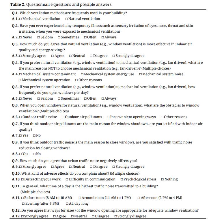 Table 2 describes the list of 12 survey questions regarding the current building ventilation systems (e.g., mechanical or natural), the preference for passive ventilation (e.g., window ventilation) or active ventilation (e.g., fan-driven ventilation), reasons for natural ventilation preference, environmental obstacles to window ventilation, negative impacts of noise transmission via ventilation windows, and the daily hours affected by high traffic noise transmission to buildings.