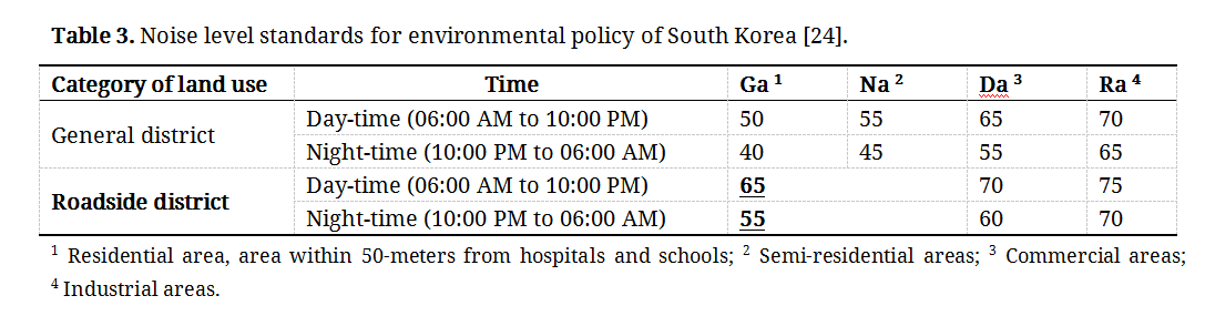 A-weighted equivalent continuous sound level is constant noise level responding to human hearing over a given period [25]. According to the measured data of LAeq at the six sites in “Ga” roadside district, which represents residential areas or areas within 50-meters from hospitals and schools, traffic noise levels exceeded the threshold of the noise level standards on the environmental policy that require them to be lower than 65 dB(A) and 55 dB(A) each, for day-time (06:00 AM to 10:00 PM) and night-time (10:00 PM to 06:00 AM) in Table 3. These values are also higher than recommended by the WHO environmental standards, as shown in Table 4, showing the level of noise annoyance based on sound pressure level (SPL). The physical and psychological impacts on building occupants’ health are evident because the adverse health effects of noise are proportional to long-term exposure to urban traffic noise. According to Table 4, building occupants will experience serious noise annoyance if they are exposed to day-time SPL of 55 dB for 16 hours.