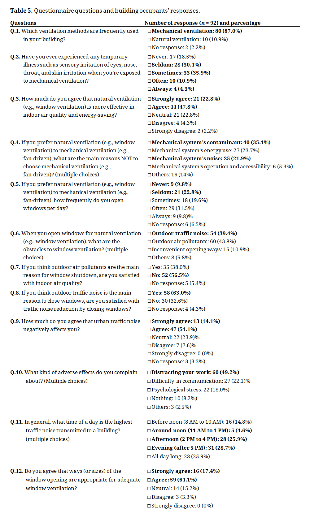 Table 5 summarizes the outcomes of building occupant's responses (n = 92 except for multiple choices in Questions 4, 6, 10 and 11) to their indoor air and indoor acoustic quality, as follows: