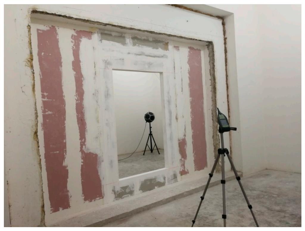 The sound transmission loss (TL) was employed to characterize the noise reduction performance of ventilation partitions. Two reverberation rooms (volumes: 115.4 m3 and 107.2 m3) are coupled through a wall with a rectangular opening, as shown in Figure 1. The opening of width 1 m and height 1.8 m was used to accept partitions of the same size. The measurement was carried out complied with ASTM E90-09 [14]. The noise generator CESVA AP 600 and omnidirectional sound source CESVA BP012 were used to generate and play pink noise in the source room. The use of pink noise is to improve the signal to noise ratio of the measurement at low frequency. The sound pressure levels at 6 points in the source and receiver rooms, respectively, were measured by the sound level meter B&K type 2250 with 1/2 inch microphone B&K 4189. Then the averaged sound pressure levels, Ls and Lr, in the source and receiver rooms can be obtained for computing the TL, that is TL=Ls - Lr - 10log(S/A) , where S represents the area of the test specimen, A is the equivalent sound absorption area of the receiver room measured according to ASTM E2235-04 [15].
