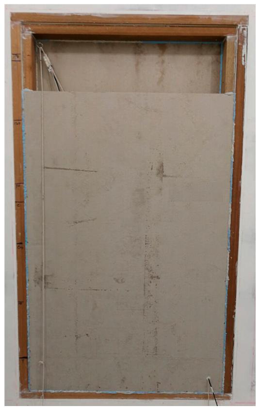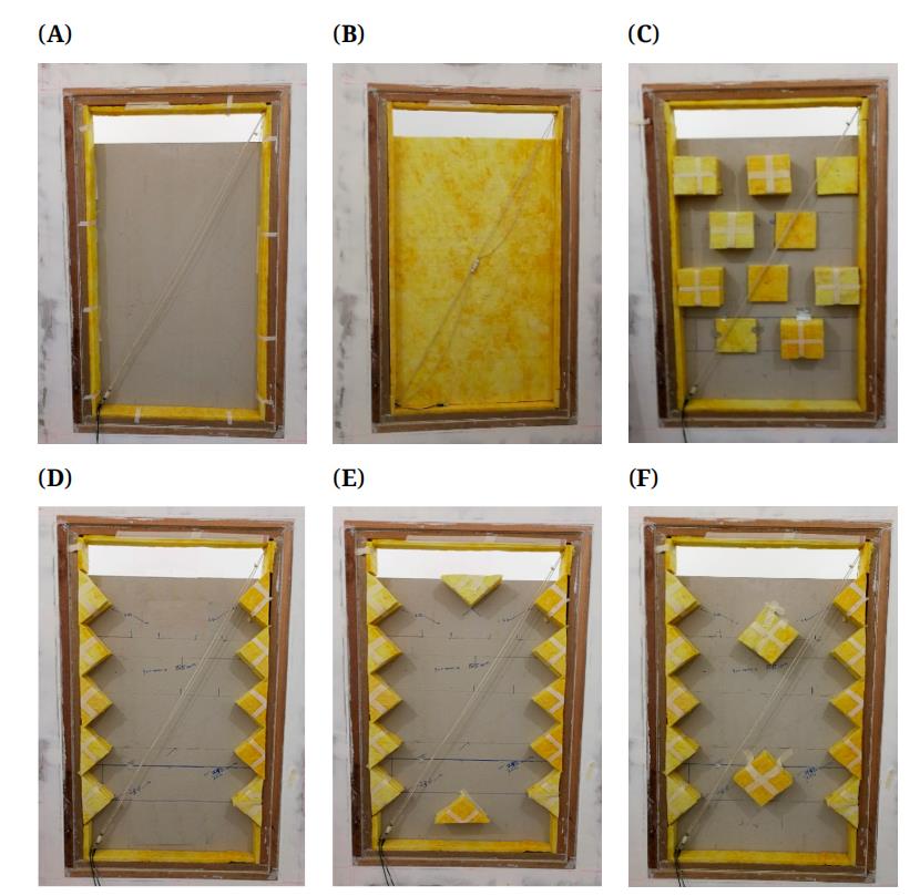 In this paper, the panels of all the partitions are the same Calcium Silicate Board (CSB) of thickness 9 mm and mass density 1050 kg/m3 to mimic the acoustical hard wall partitions. In terms of ventilation partitions, the spacing between the two panels is 0.082 m, therefore the total thickness of ventilation partitions is 0.1 m. Figure 2 shows the front view of ventilation partitions. Figure 3 shows the cross-section view of the ventilation partition without any acoustical treatment (Case B0), in specific, the left opening of height 0.225 m faces to the source room while the right one of the same size faces to the receiver room. Figure 4 displays the configurations of 6 different configurations of acoustical treatments (Cases C1–C6) implemented in the cavity between the two panels. The detailed description of the 6 cases is presented in Table 1. The sound absorbers are made up of fiberglass of density 80 kg/m3. The sound absorption coefficient of the fiberglass with thickness 25mm and surface area 8.64 m2 was measured in a reverberation chamber referring to [15] and as listed in Table 2.