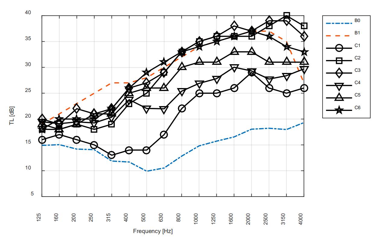 As mentioned earlier, ventilation partitions consist of two partition panels with two staggered openings. This section will present the TLs of ventilation partitions with 6 different configurations of acoustical treatments. As a baseline, the TLs of a ventilation partition without any acoustical treatment and a closed single-layered partition were tested as well. In total, the TLs of 8 partitions were measured and compared.